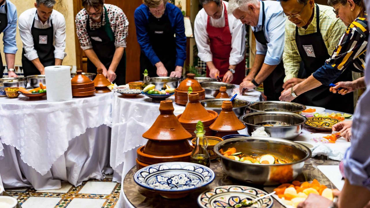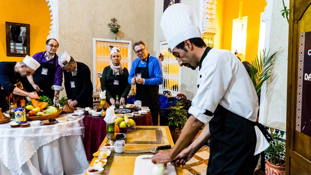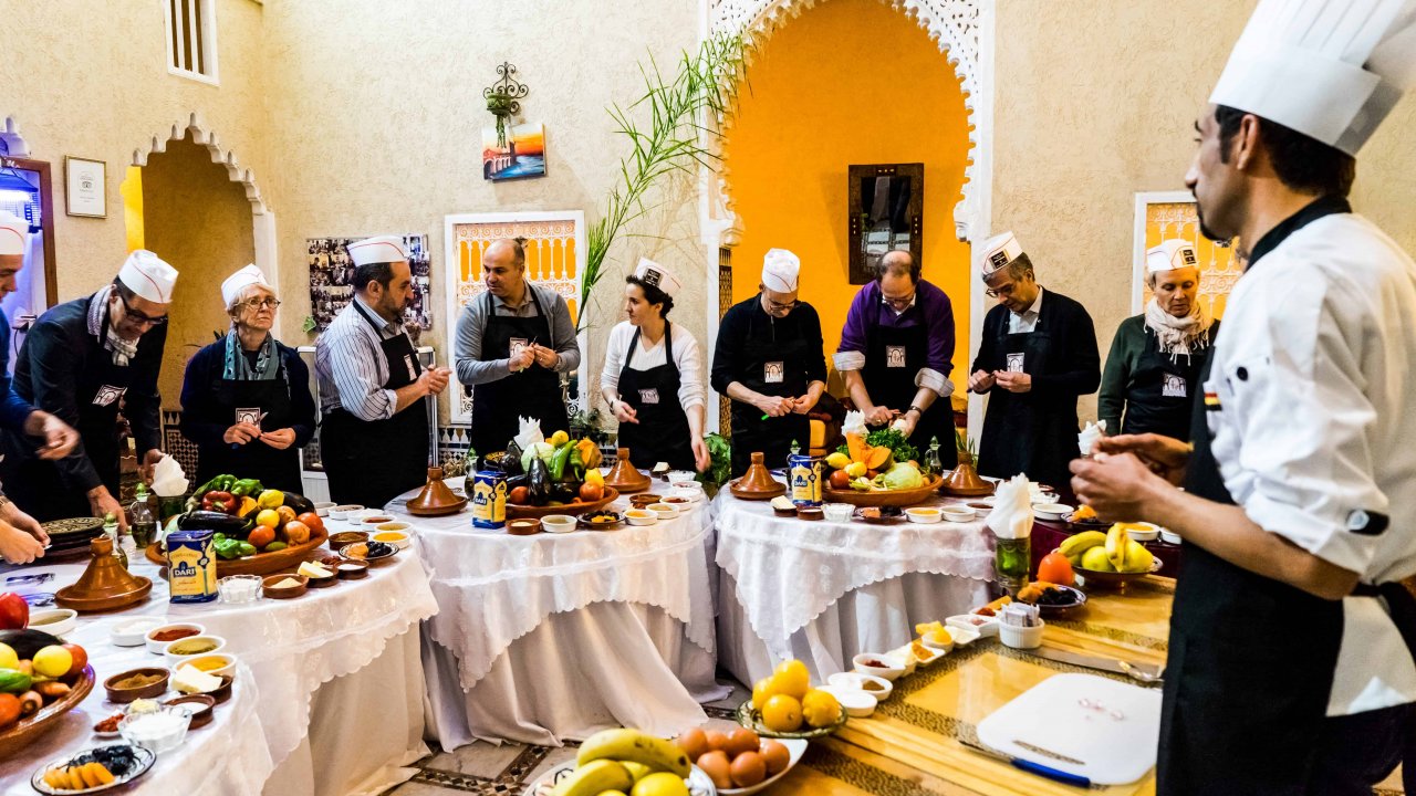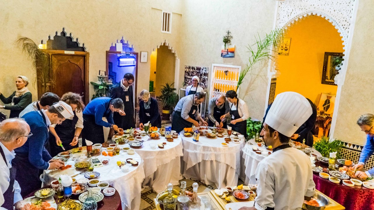 With our shopping in the market done, next, enjoy a warm welcome at a historic family-owned Riad. Here, you'll join the chef's brigade and uncover the gastronomic secrets of Rabat. Learn Moroccan cooking techniques and create gourmet dishes in a lively, interactive setting.